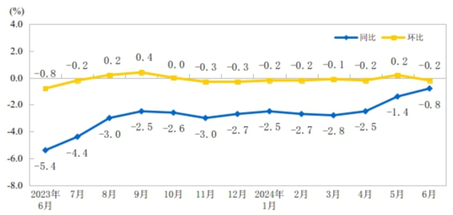 2024年6月份,全国工业生产者出厂价格同比下降0.8%,降幅比上月收窄0.6个百分点,环比由上月上涨0.2%转为下降0.2%;工业生产者购进价格同比下降0.5%,环比上涨0.1%。上半年,工业生产者出厂价格比上年同期下降2.1%,工业生产者购进价格下降2.6%。